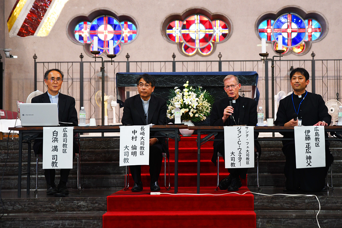 今年の「平和旬間」に先立ち、8月5日に世界平和記念聖堂(広島市中区幟町4-42)において、2024年度の広島教区の平和行事が「核兵器のない世界をめざして、ともに歩もう」というテーマで開催されました。被爆者(広島教区の深堀升治神父)の証言の後に、基調講演(14:00~15:30)が行われました。この講演のために、昨年に引き続いて、米国ニューメキシコ州のサンタフェ(Santa Fe)のジョン・ウェスター(John. C. Wester)大司教が来広され、長崎の中村倫明大司教、広島の白浜司教とともに、「核兵器のない世界のためのパートナシップ」の設立の経緯、意図(目的)、規約等についての説明を行い、世界のカトリック教会の諸団体(教区、修道会、宣教会、教育機関、施設等)に向けて、パートナシップの構築への協力依頼がなされました。